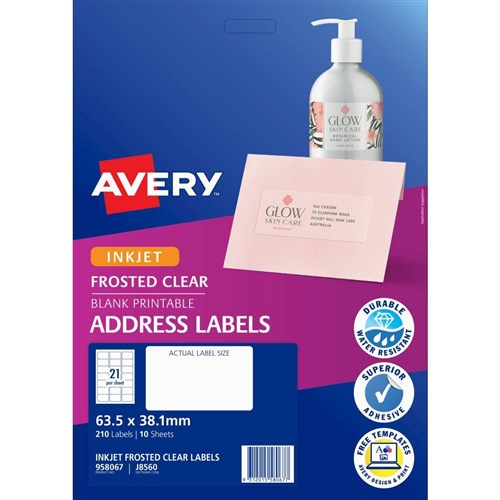 Avery Frosted Clear Inkjet Address Labels J8560 63.5x38.1mm 21UP 210 Labels