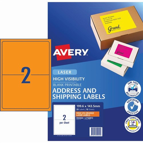 Avery High Visibility Shipping Laser Labels Orange L7168FO 199.6x143.5mm 2UP 20 Labels