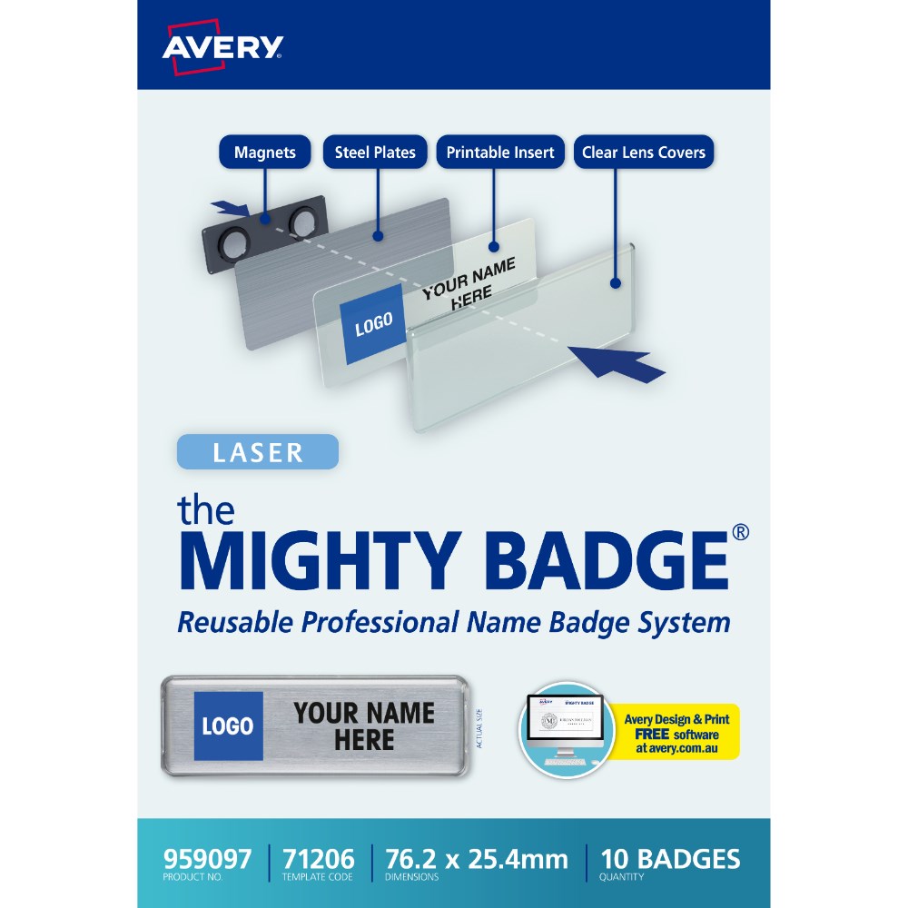 Avery Mighty Badge System For Laser Printer 71206 76.2 x 25.4mm Set Of 10 Silver