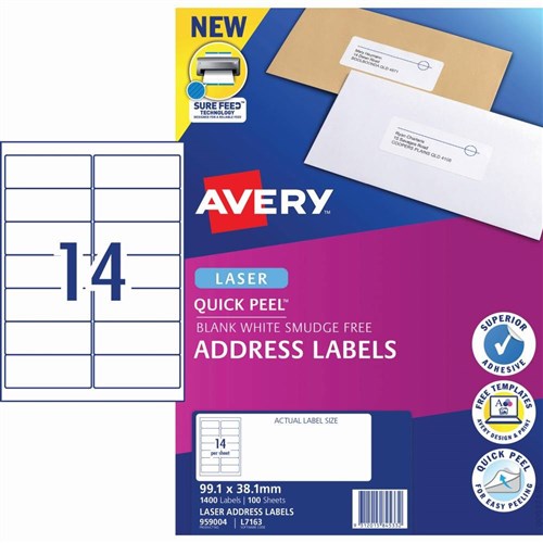 Avery Quick Peel Address Laser White L7163 99.1x38.1mm 14UP 1400 Labels 100 Sheets