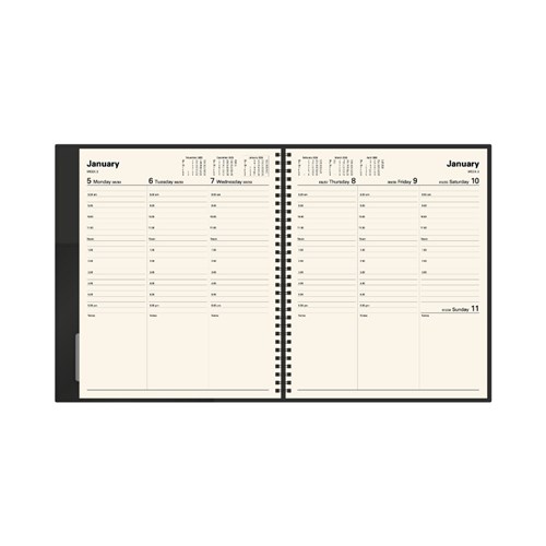 • Pen loop, lay flat opening, ribbon marker, vertical week to view layout.