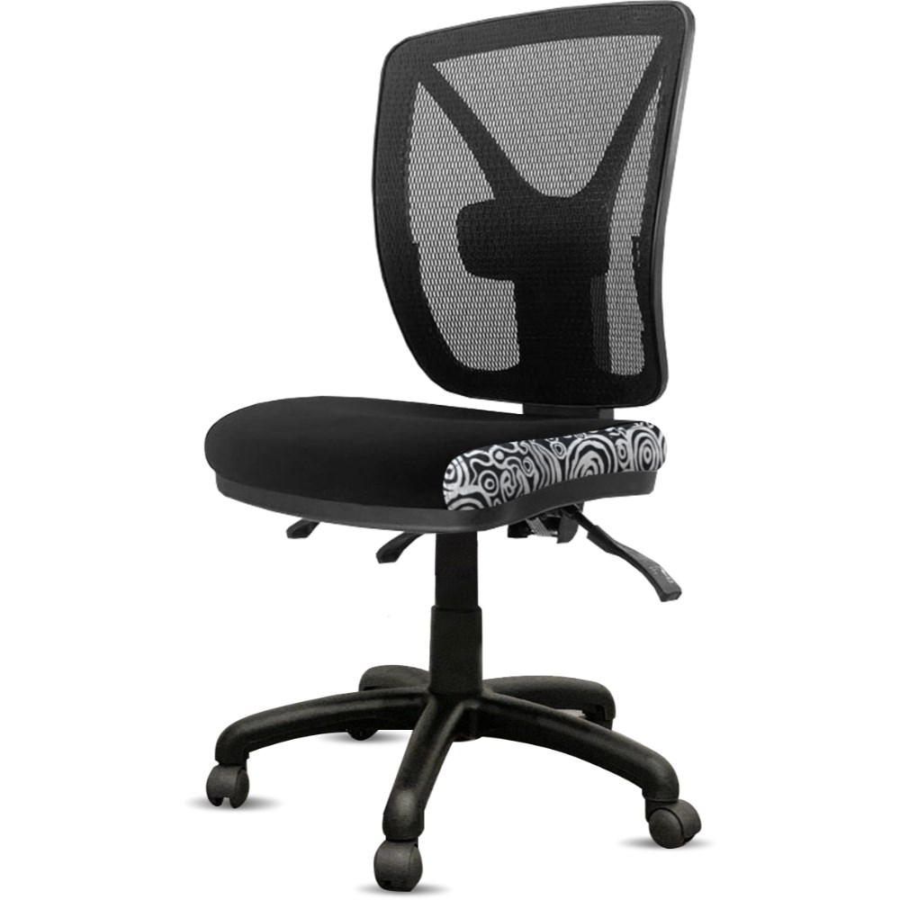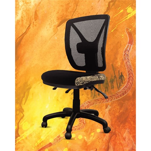 • A unique commercial fabrics designed by Nelly Patterson (Indigenous Artist) combined with K2 Black Fabric to upholster the chair.