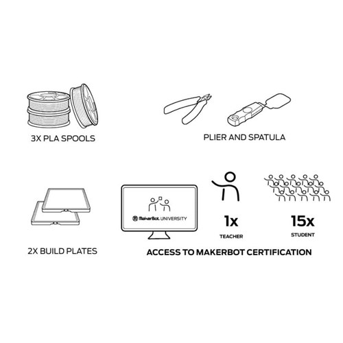 • It includes 1 Sketch printer, 3 spools PLA, 2 build plates, 1 teacher and 15 student MakerBot certification program.