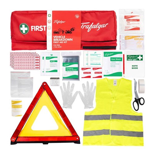 • 1 x Gloves Disposable Pair, 1 x Notepad and Pencil, 12 x Safety Pins Assorted, 1 x Safety Triangle, 1 x Safety Vest High Visibility (Yellow), 1 x Scissors, 1 x Tape Hypoallergenic 1.25cm x 9m.