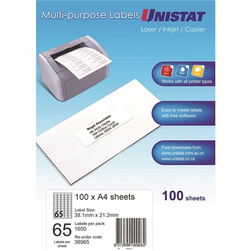 Unistat Laser Copier & Inkjet Labels 38.1x21.2mm 65UP 6500 Labels 100 Sheets